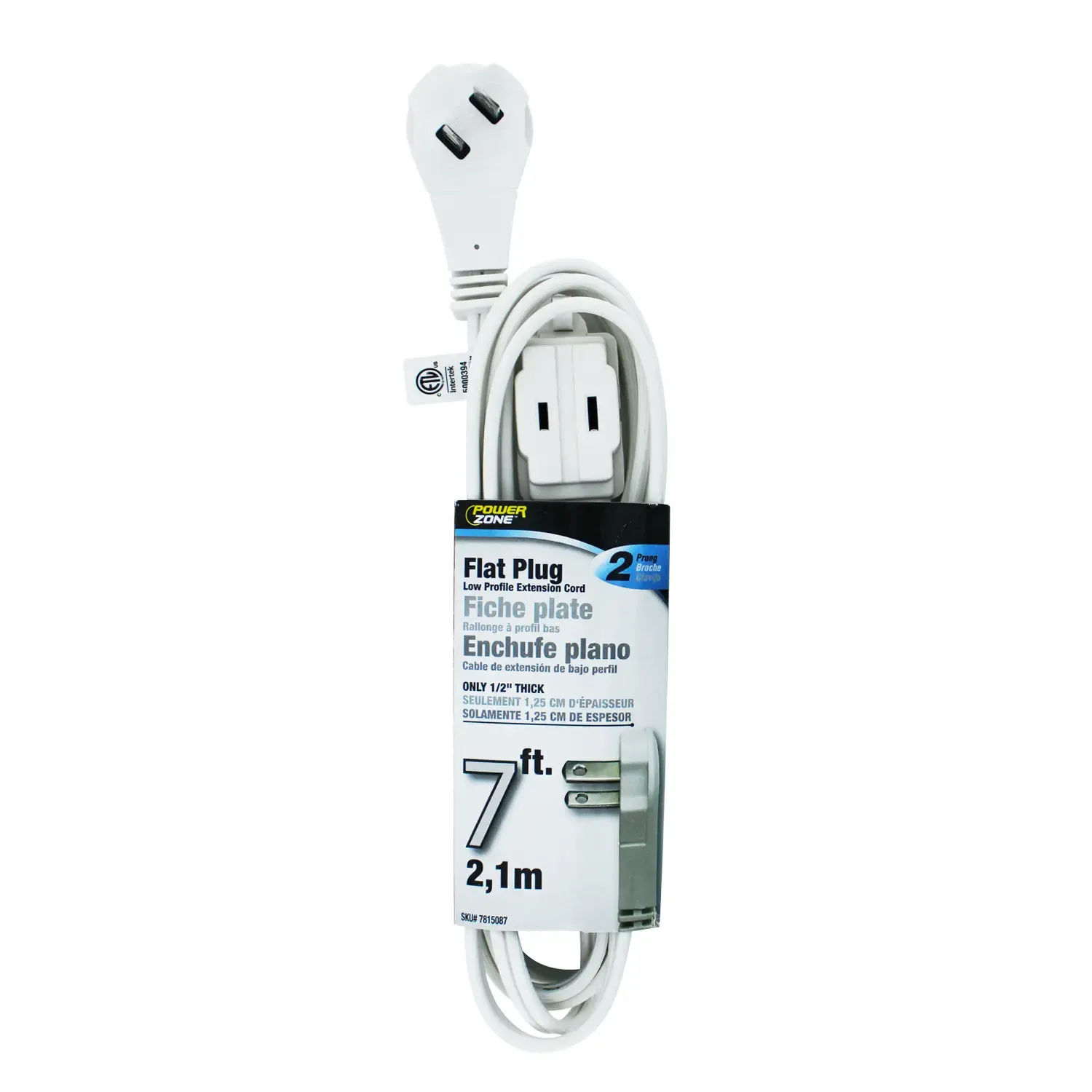Extension Cord, Indoor, 16/2 SPT x 7 ft, Slimline with Flat Plug, 3 Outlet, WHITE, Powerzone