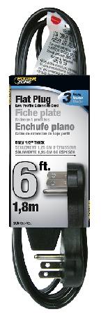 Extension Cord, Indoor, 16/3 SPT x 6 ft, Slimline w/Flat Plug, 3 Outlet, BLACK, Powerzone