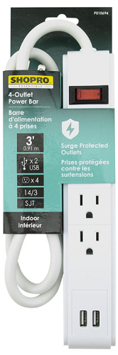 Power Bar, 4-Outlet + 2x USB, Lighted On/Off Switch, Surge Protected, 3 foot Cord, WHITE, Shopro