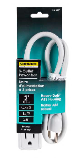 ~Power Bar, 3-Outlet ABS Case, 2 foot Cord, WHITE, Shopro