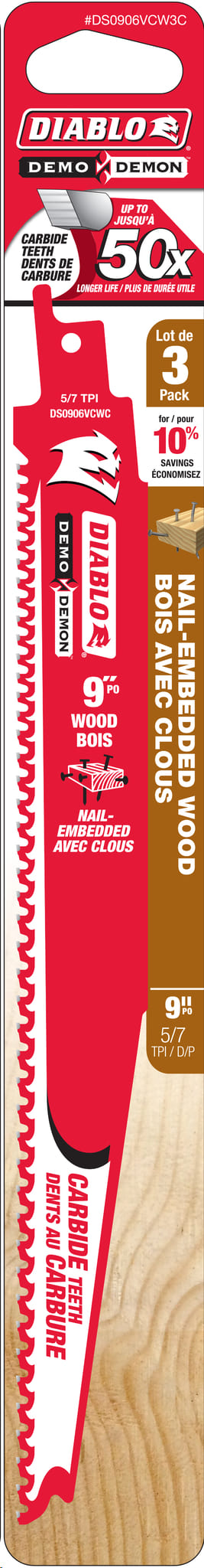 Reciprocating Saw Blade, Carbide, 9"x 5/7 TPI (nail-embedded wood) 3/pkg