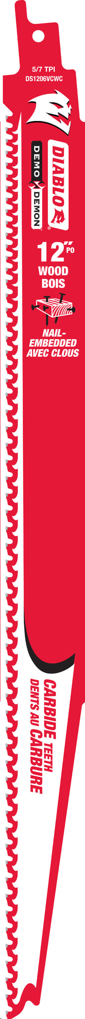Reciprocating Saw Blade, Carbide, 12"x 5/7 TPI (nail-embedded wood)