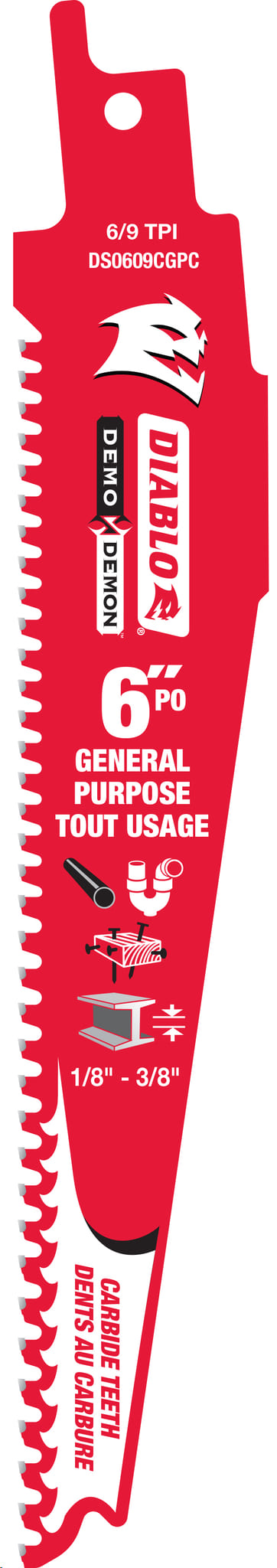 Reciprocating Saw Blade, Carbide, 6"x 6/9 TPI (general purpose & metal cutting to 3/8" thick)
