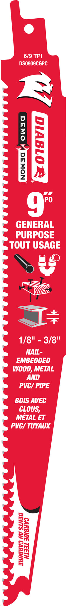 Reciprocating Saw Blade, Carbide, 9"x 6/9 TPI (general purpose & metal cutting to 3/8" thick)