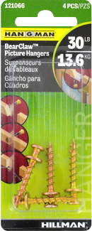 Bear Claw Picture Hangers, Self-Drilling for Drywall, 30 lb max capacity, 4/pkg