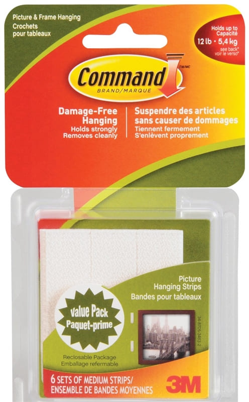 ~Picture Hanging Strips, Self-Adhesive, Medium, 3M Command, 6/pkg (17204C) 12 lb capacity