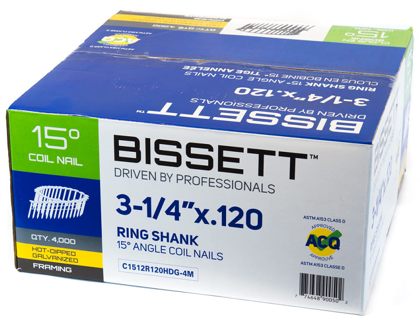 Coil Framing Nails, 3-1/4" x .120, 15-Degree, Ring Shank, Galvanized, 4000/box