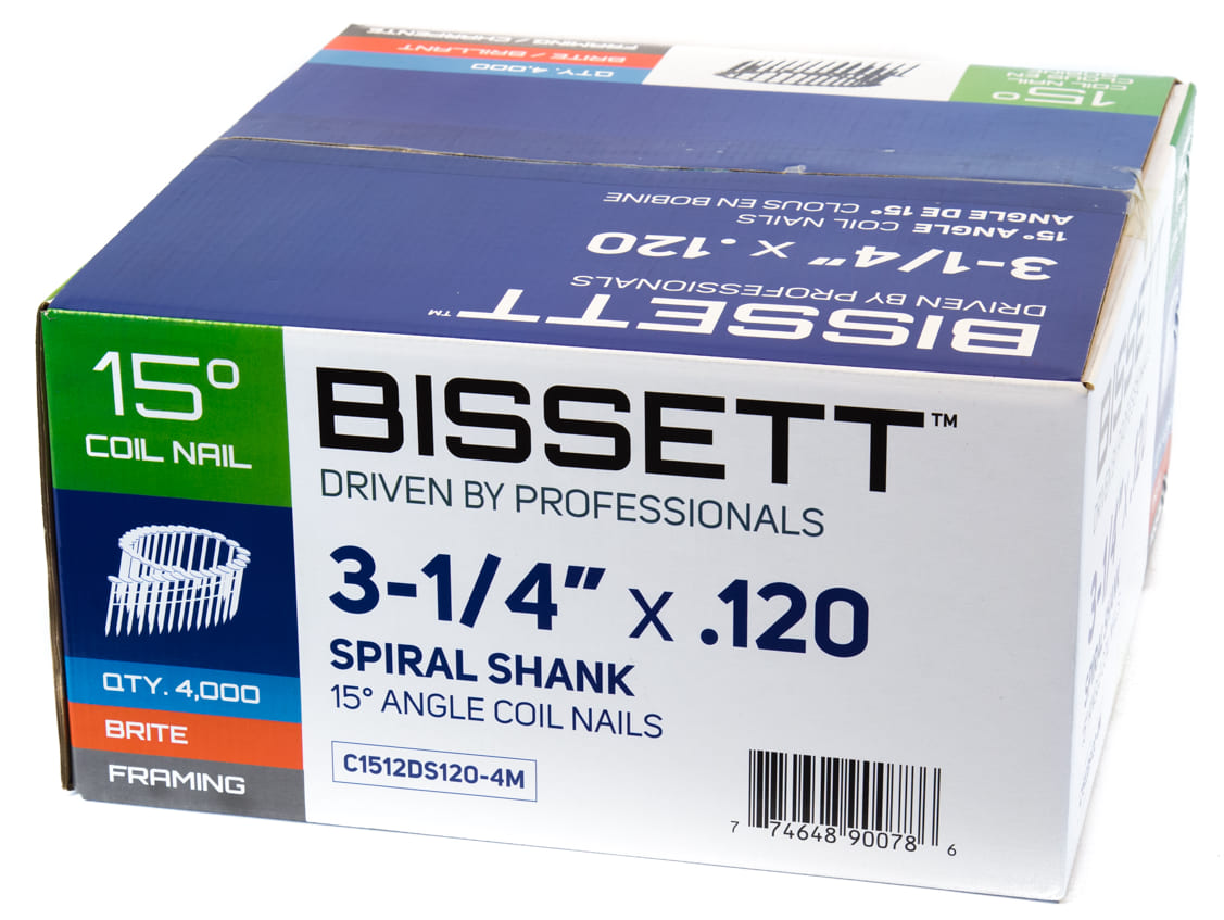 Coil Framing Nails, 3-1/4" x .120, 15-Degree, Spiral, Brite, 4000/box