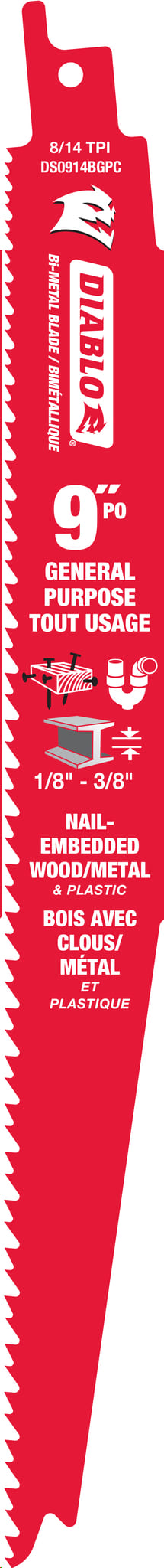 Reciprocating Saw Blade, Bi-Metal, 9"x 8/14 TPI (general purpose & metal cutting to 3/8" thick) bulk