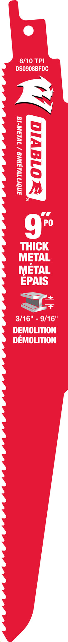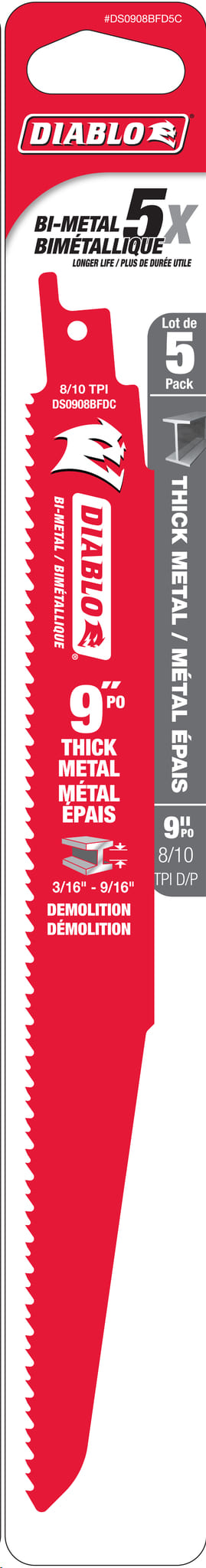 Reciprocating Saw Blade, Bi-Metal, 9"x 8/10 TPI (metal cutting to 3/16" - 9/16" thick) 5/pkg