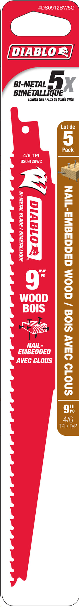 Reciprocating Saw Blade, Bi-Metal, 9"x 4/6 TPI (nail-embedded wood) 5/pkg