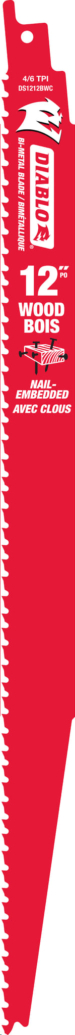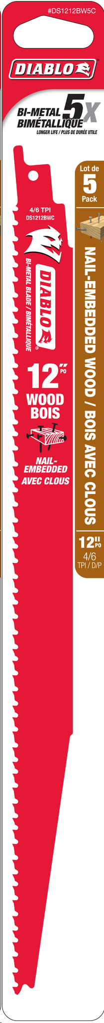 Reciprocating Saw Blade, Bi-Metal, 12"x 4/6 TPI (nail-embedded wood) 5/pkg