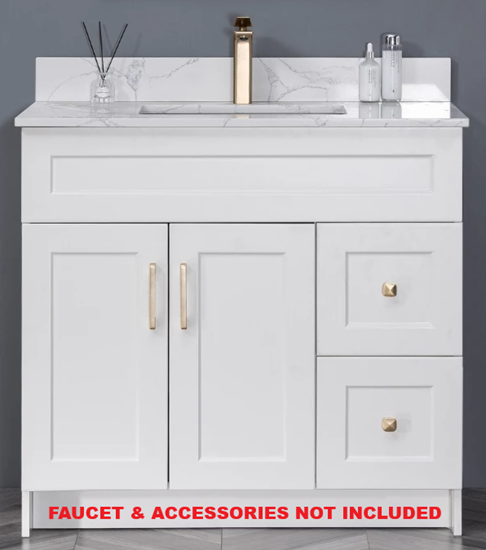 Vanity Base & Top, 2-Door/2-Drawer (RH), 36"W x 21"D, Quartz Top, WHITE/WHITE, TopCan