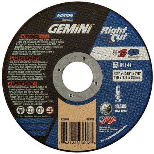 Cut Off Wheel, Metal, 4-1/2" x .045" x 7/8" Arbour, Type 01/41, Gemini "Right Cut"